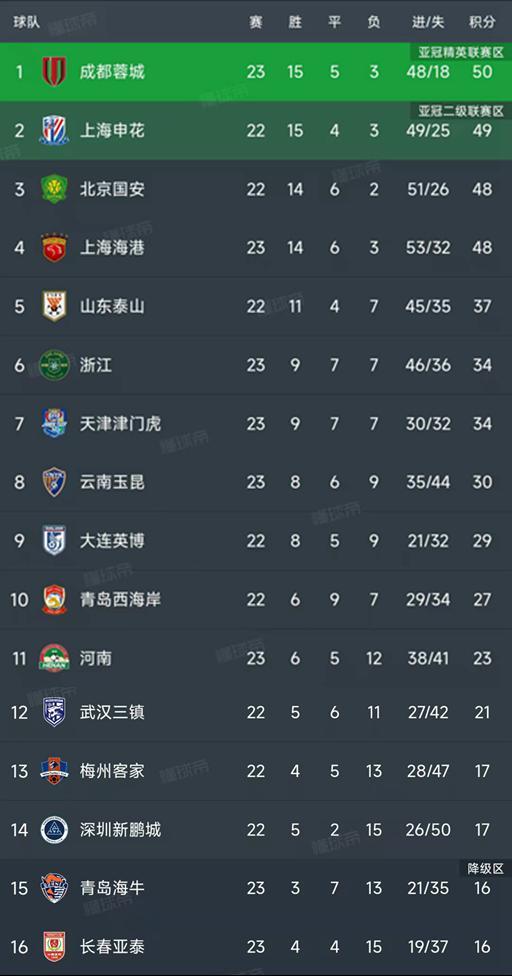 中超最新积分榜